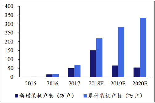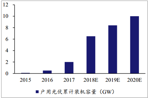 户用光伏市场广阔,未来大有可为。预计国内有超过4000万户独立屋顶,其中约有50%具备安装户用光伏系统的条件,假设每套装机容量为5kW,那么装机容量能够达到100GW。如果具备安装条件的屋顶中有 20%-50%安装户用光伏系统,那么市场规模将达到3,200-8,000亿元,而目前已经开发的屋顶数量占比还不到5%,市场前景良好。2018年我国户用光伏累计装机量预计能够达到6-8GW,预计2020年市场规模可以超过10GW。