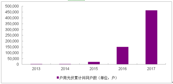 2013年底,国家层面的分布式光伏补贴政策正式发布,2014年-2015年相关政策逐渐渗透到基层,2016年前后,光伏行业巨头开始布局户用市场,进入2017年,相关业务开始逐步落地。2017年全年全国户用累计并网户数达到46.5万户,同比增长超过200%。