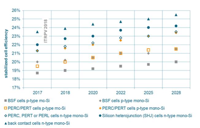 根据最新的国际光伏技术路线图(ITRPV-2018)中电池转换效率显示,目前常规单晶电池的量产转换效率在20.2%左右,而单晶PERC电池量产转换效率在21.5%左右。