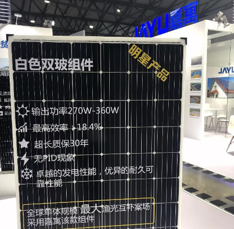 展品展示包括光伏组件、户用光伏、光伏电站项目、扶贫项目展示区。今年嘉寓展台一大亮点为白色双玻组件产品,全球单体规模最大渔光互补案场采用嘉寓该款组件。该产品输出功率270W-360W;最高效率18.4%;超长质保30年;无PID现象;具备卓越的发电性能,优异的耐久可靠性能。