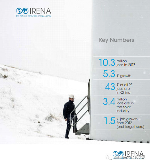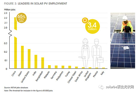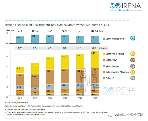 根据国际可再生能源署(IRENA)统计,2017年,可再生能源行业为全球创造了超过50万个新的工作岗位,从业人数超过1000万人。从细分领域来看,光伏行业就业人数新增9%,达到340万人,其中德国、土耳其、英国、意大利等欧洲国家有10万人左右,比上年略有减少。索比光伏网认为,随着欧洲光伏产品贸易开放,组件制造企业的就业人数预计会继续降低,但下游安装、运维领域就业人数会明显增加,总体就业形势回暖。