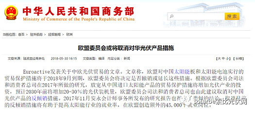 近日,中华人民共和国驻荷兰共和国大使馆经济商务参赞处援引Euroactive文章称,欧盟对中国太阳能板和太阳能电池实行的贸易保护措施将于2018年9月到期,欧盟委员会司法和消费者总司建议取消对中国光伏产品的反倾销措施。这一消息也得到了中国商务部的证实。