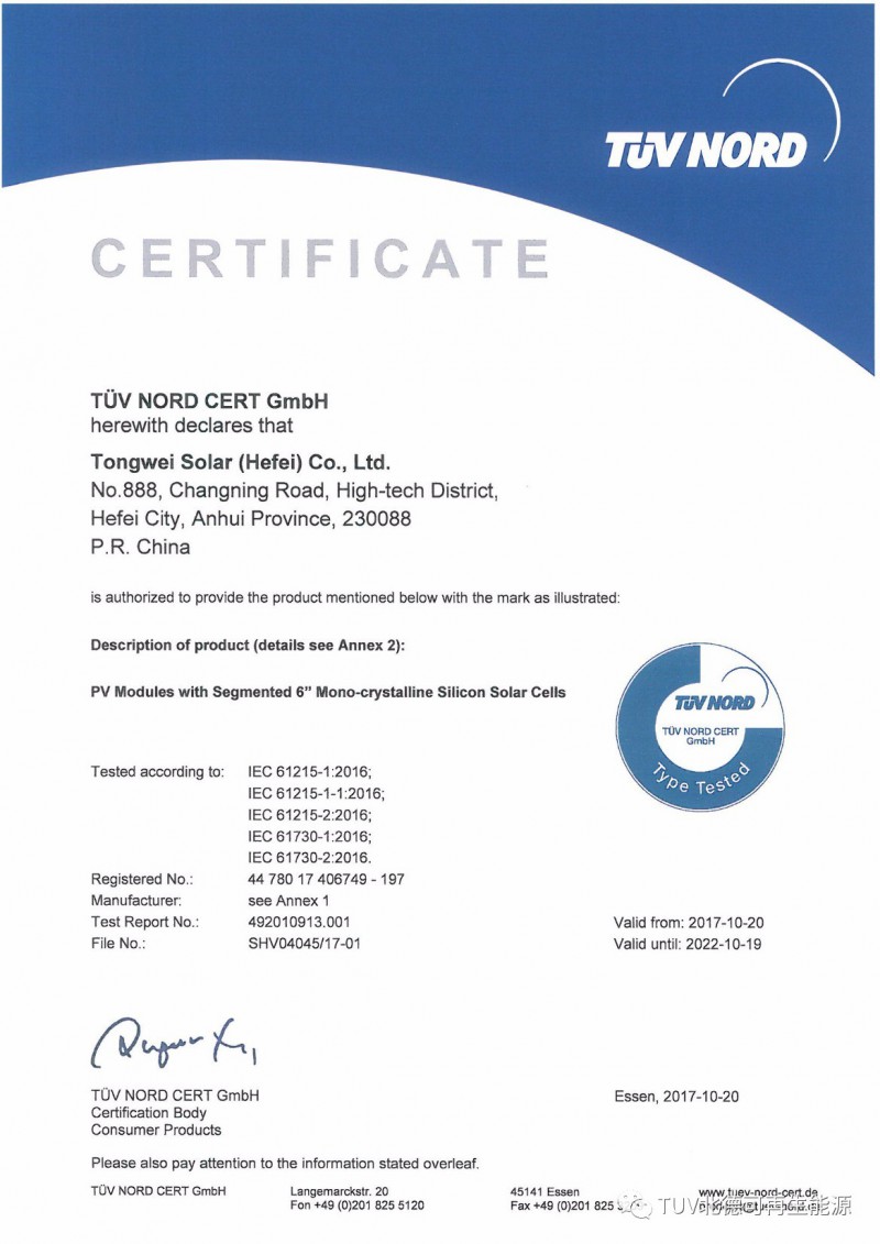 通威太阳能使用单晶电池生产的叠瓦组件顺利通过IEC新版标准认证,其中单晶叠瓦组件获得全球首家新标认证,再次证明了通威太阳能卓越的创新和量产能力。
