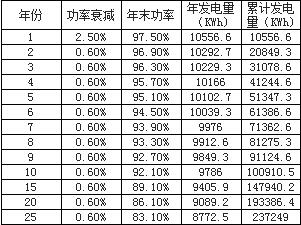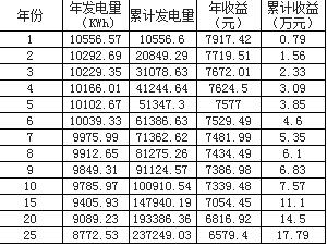 我们以山东济南一户安装了30块265Wp的高效组件,装机容量共7.95KW,系统效率=85%,按照8元/w的系统价格计算,需要用户投入资金约63600元。项目安装地济南地区全年日平均有效发电日照时数为4.28*365=1562.2小时(山东属于日照条件比较好的地区,可以达到1500小时,全国的平均水平约为1300小时左右)。假设组件首年衰减2.5%,之后每年衰减0.6%。可以算出一个8KW系统,使用一台8KW单相机逆变器,20年累计发电量约为20万度,25年的累计发电量约23.7万度。