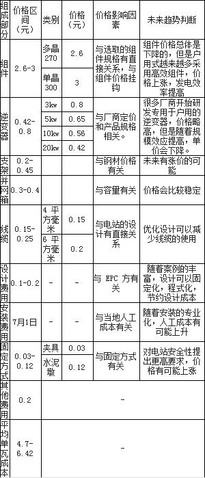 由于光伏材料的价格变化比较快,5-6.5元的每瓦成本仅作为市场参考值,由于厂家和经销商还要在当中环节获利,假设厂商每瓦获利0.5-1元,经销商每瓦获利1-1.5元,那么到消费的价格大致是6.5-9元。与现在市场行情基本相符。从各个环节的价格影响因素和未来趋势判断,我们可以看到未来户用式光伏单瓦价格不一定会下降,但是发电效率和安全性是一定会提高的。户用光伏作为直接面向消费者的产品,具有投资品和消费品的双重属性,因此市场价格必然会有较大差异,产品差异性也会长期存在。但是有一点必须提出,户用式光伏由于较高的单位成本,短期内还是需要依靠补贴来保证收益率。