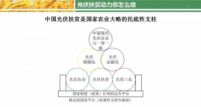 再说光伏扶贫的掀动市场。我认为对扶贫市场的掀动已经不仅仅是前时的扶志,扶贫与扶智了,亦或就是要以新农村作主题词的三个新扶点,那就是在扶贫的基础上;我们要再扶新农村能源的消纳,扶新农村农业的发展,扶新农村生态的修复。因为没有能源经济的提升,没有现代农业的前景,没有自然生态的恢复,就失去了给扶贫续力的动力,没有动力的买卖和事都是做不好的,也是维续不长的。