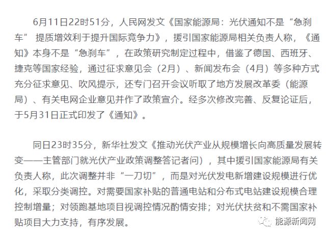 6月11日深夜,人民网和新华社两大官媒发文释疑光伏新政:不是急刹车、一刀切。