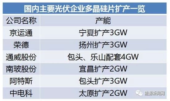 多晶方面,计划投/扩产的项目有京运通宁夏扩产3GW、荣德扬州扩产3GW、通威股份包头、乐山配套4GW、中电科太阳扩产2GW、南玻股份宜昌扩产2GW、阿特斯包头扩产3GW,总计将扩产17GW。
