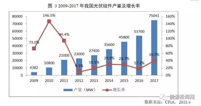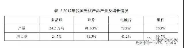 中国光伏行业协会(CPIA)近日发布《2017年我国光伏产业发展情况》显示,2017年我国多晶硅产量24.2万吨,同比增长24.7%,硅片产量91.7GW,同比增长41.5%,电池片产量72GW,同比增长41.2%,组件产量75GW,同比增长39.7%。