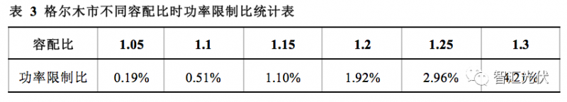 首先,根据格尔木市完整1年逐时的太阳能辐照度数据,采用PVsystem对采用最佳固定倾角(36°)时倾斜面上的逐时辐射量进行计算;其次,根据倾斜面上的逐时辐射量计算出光伏组件的逐时出力;再次,计算光伏组件的出力考虑90.8%的系统效率后,到达逆变器的功率;最后,根据到达逆变器功率计算结果,将大于额定功率的部分计为功率限制,获得不同容配比时的功率限制比,如表3。
