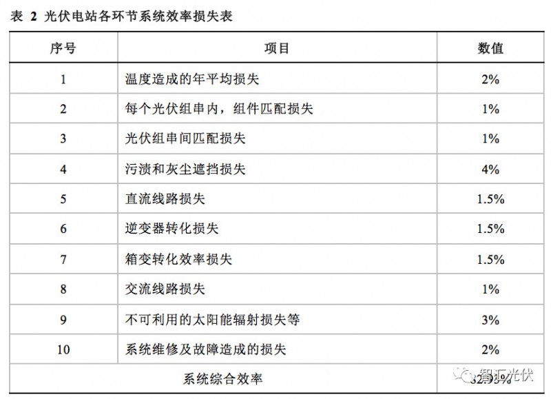 据统计,我国光伏电站整体的系统效率为80%左右。假设各环节的系统效率损失如表2。