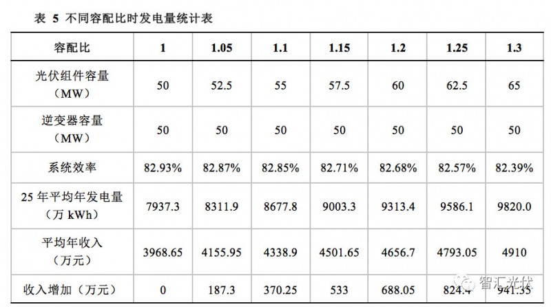 根据表3中的功率限制比,光伏组件按照10年衰减10%、25年衰减20%考虑,则不同容配比下,发电量情况如下表所示。另外,按照0.5元/kWh的上网电价,售电收入年增加如下表。