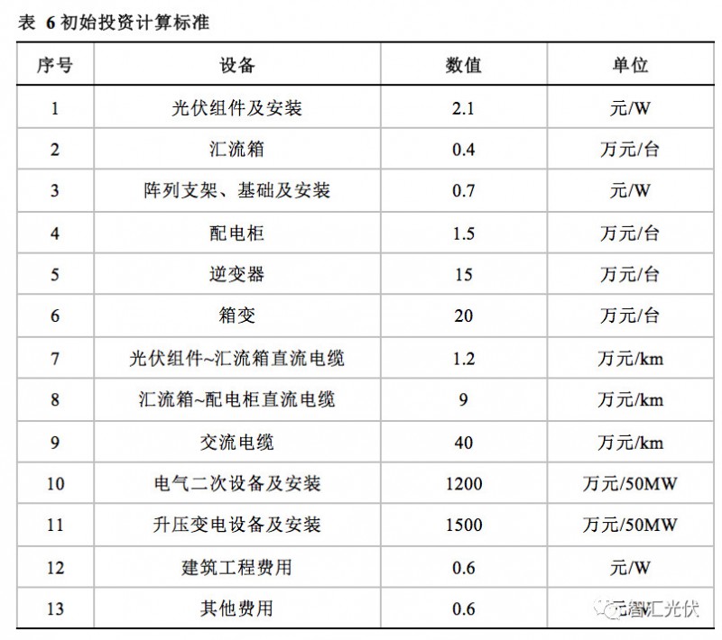 光伏电站的投资造价按下表中的标准进行计算。