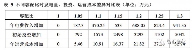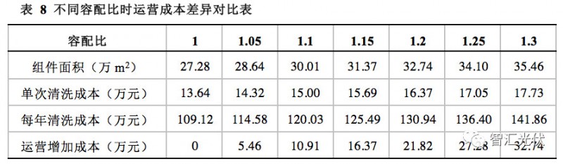 由于运维费用主要为光伏组件清洗成本增加。光伏组件的清洗费用按照0.5元/m2、每年清洗8次考虑。则不同容配比的清洗成本如下表所示。