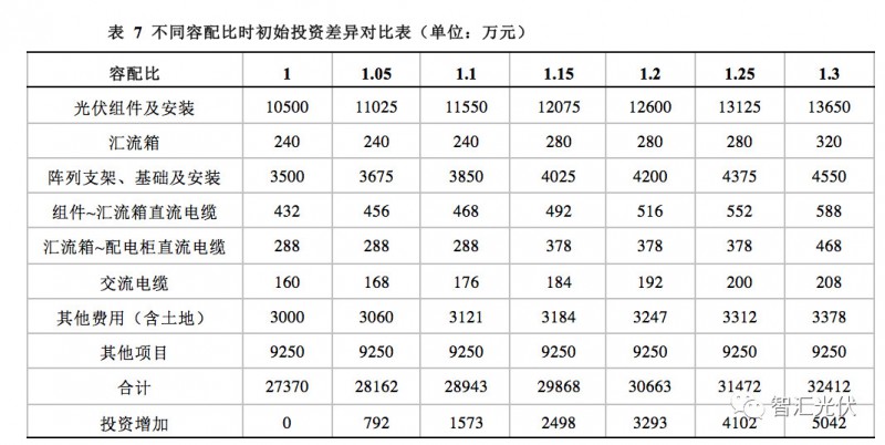 按照表6中的标准,采用不同容配比时,初始投资的主要差异如下表所示。