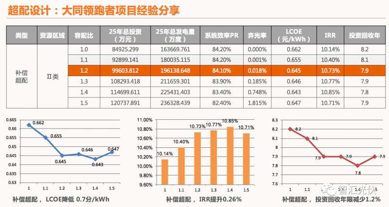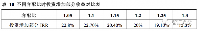 从上表可以看出,容配比从1.05~1.3时,由于功率限制比未成比例增加、逆变器利用率增加,而从逆变器~升压变电站部分的投资没有变化,因此投资增加部分的IRR高于一般光伏电站项目。增加部分投资的收益率甚至可以实现到20%以上的高回报率。