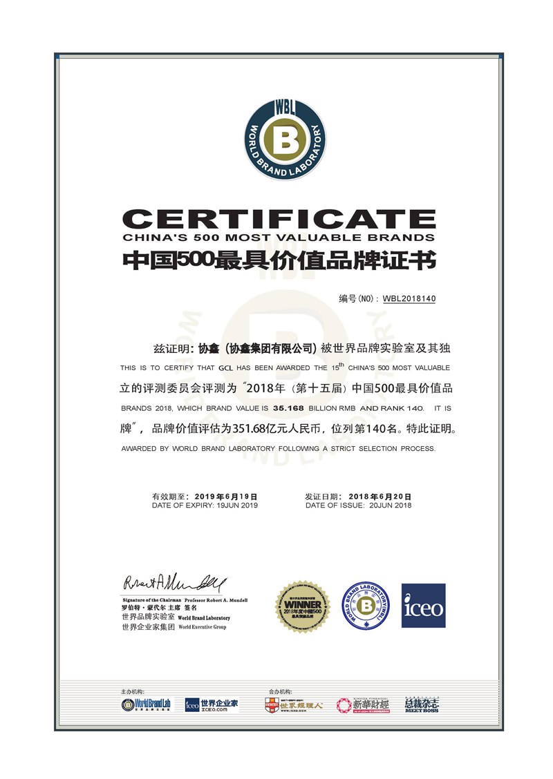 由世界品牌实验室(World Brand Lab)主办的(第十五届)“世界品牌大会”于6月20日在北京举行,会上发布了2018年《中国500最具价值品牌》分析报告。在这份基于财务数据、品牌强度和消费者行为分析的年度报告中,国家电网以4065.69亿元的品牌价值荣登本年度最具价值品牌榜首。占据榜单前五名的还有腾讯(4028.45亿元)、海尔(3502.78亿元)、工商银行(3345.61亿元)、中国人寿(3253.72亿元),这些品牌已经迈进世界级品牌阵营。作为第一次参评的协鑫集团,以351.68亿元的品牌价值位列中国500最具价值品牌第140位。