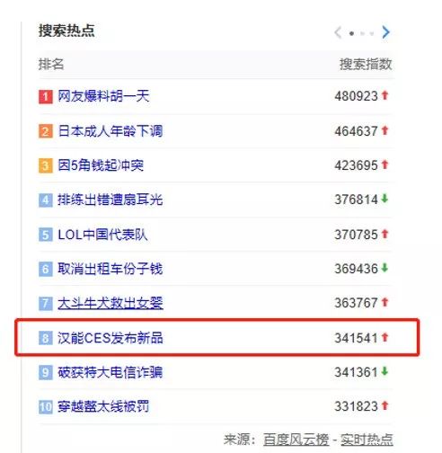 2在CES Asia 2018这样各路厂商都拿出看家宝贝参加的盛会上,我们一家跨界入局的能源企业却带来了如此吸人眼球的高科技电子消费品,使得整个展台出现了人头攒动、水泄不通的狂热局面,让“隔壁邻居们”的人流相形见绌,连果壳COO也忍不住来亲临感受。在央媒、门户、科技类媒体的争相传播下,达到了触及一亿人次的传播声量,并收获了一个意外惊喜,“汉能CES发布新品”在百度热搜排名第8位,还在持续升温中。对不起,我们真的太高调了。