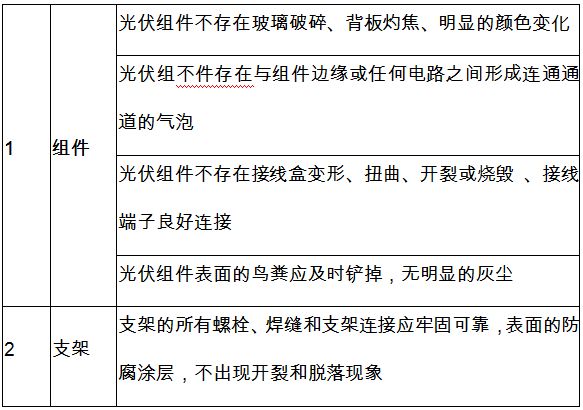 检查维修项目:组件边框、电池片、玻璃、组件表面、接线盒、背板、铭牌、导线、光伏组件上的带电警告标识、边框和支撑结构、其他缺陷等。