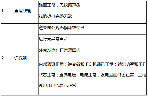 检查维修项目:光伏方阵整体、受力构件、连接构件和连接螺栓、金属材料的防腐层、预制基座、阵列支架、等电位连接线、接地可靠性,其它缺陷等。
