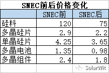 531政策一出,大家一下子傻眼了,国内下游电站客户的习惯是只支付10%的预付款,这也就导致违约成本低,531新政出来以后的结果就是大量电站业主纷纷打电话来告知组件企业取消订单或者起码订单延期,处于懵逼状态的户用和分布式经销商更是不知道订单该怎么签,已经签好的订单该怎么执行。能存活到现在的国内的光伏制造企业都是经历过大产业周期的企业,对光伏产品长期跌价的特性是非常熟悉的,在光伏产品库存管理方面都谨小慎微,但再谨慎的库存管理也敌不过如此大的政策突变。对国内630行情过分乐观的预估叠加5.31后订单退订潮致使制造业企业库存管理彻底失效。需求的停滞叠加库存管理失效使得价格断崖式下滑,并迅速向上游各个环节传导,下图是SNEC展会前后部分光伏产品价格对比。