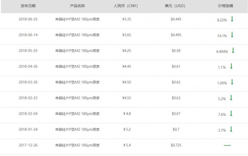 180μm厚度、低电阻单晶硅片价格降至国内每片3.65元人民币、海外0.495元美金 ,每片下降0.6元人民币、0.085元美金,价格跌幅为14.1%。