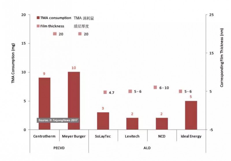 图5. PECVD和ALD不同模式TMA的耗量(数据来源Taiyang News 2017)