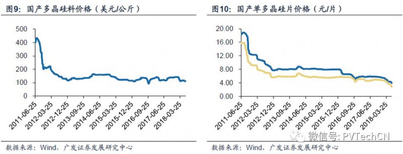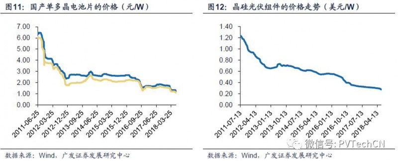 政策出台后,市场对于2018年新增光伏装机预期下调,而最直观的反馈是产业链价格出现了明显的下滑。可以说,政策在一定程度上起到了“供给侧”改革的作用,加速落后产能的淘汰推动市场集中度的提升。