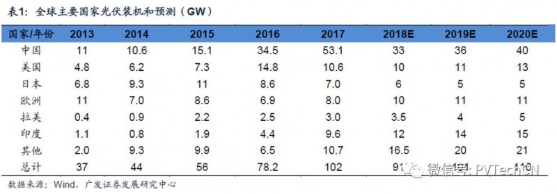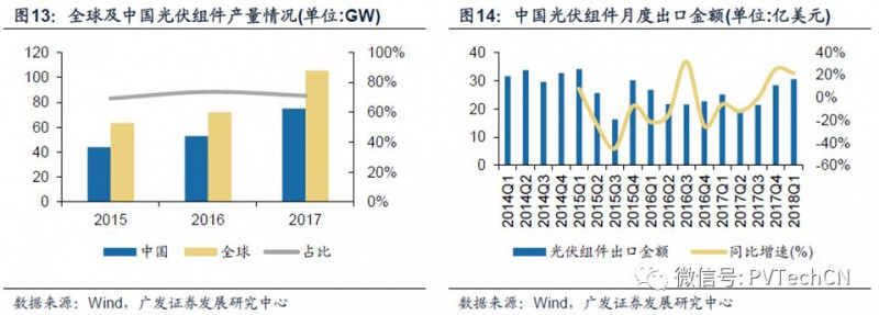 中国作为全球最大的光伏市场,同时也是光伏材料产量最大的生产国。2017年中国光伏组件产量为75GW,占全球的产量比重71.09%,海外市场的发展也会对国内光伏制造业具有明显的拉动作用。