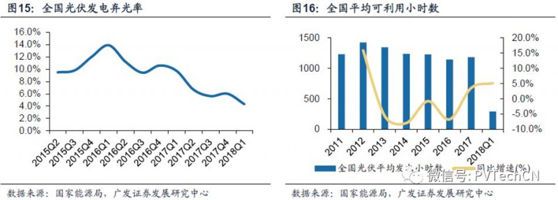 解决光伏发电消纳问题是能源主管部门的重要工作之一。国家能源局的数据显示,2017年国内弃光电量73亿千瓦时,弃光率为6%;平均可利用小时数1182小时,同比增速3.5%。2018年一季度弃光率下降至4.3%,平均可利用时数为289小时,同比增速为5.1%,弃光及消纳问题得到显著改善。