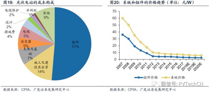 组件对光伏系统项目的成本占比达51%,通过组件效率的提升进而降低系统成本,是光伏行业发展的明确路径。目前从不需要补贴的分布式项目来看,随着组件价格的持续下跌,分布式光伏系统成本做到4元/W甚至更低是完全有可能的,可以在用户侧率先实现平价上网。同时,在隔墙售电等政策的推动下,不需要补贴的工商业分布式有望在某个时点迎来爆发,成为新一轮装机的增量来源,并且进一步提升分布式装机的渗透率。