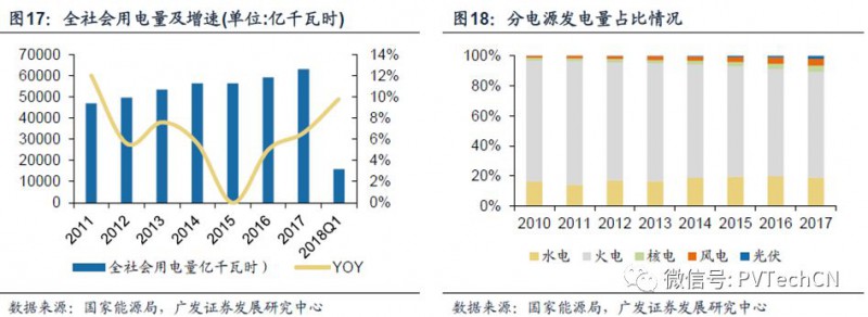 平价上网后,光伏行业长期的增长将体现在全社会用电量增速,新能源替代火电等方面。2018年一季度全社会用电量累计15878亿千瓦时,同比增长9.8%。自2015年以来全社会用电年复合增长超过6%,在宏观经济保持平稳增速的前提下,年均用电量成长预计可实现5%左右,间接拉动整个光伏发电的需求。