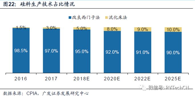 硅料和流化床技术。降本增效一直是光伏行业最重要的内容,而硅料在光伏行业的过去历史上,是降本空间较大的子环节,除了规模的持续扩张,硅料提取与生产的技术成本也影响甚大。目前,改良西门子法生产工艺相对成熟,采用此方法生产的多晶硅约占据国内市场总产量约97%,未来仍将是主流生产工艺。而流化床法生产工艺也是近年国内企业积极探索的领域,预计未来随着技术发展相对成熟安全,市场占比将会逐步提升。