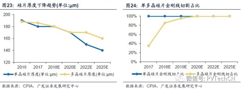 硅片薄化有利于降低硅耗和电池成本。目前单晶硅片平均厚度在180μm;多晶硅片厚度约在185-190μm。单晶硅采用金刚线切割,按单晶硅片厚度190um测算,金刚线直径每下降10um,单片硅成本下降约0.15元,产能提升可达4%,成本降幅空间大。目前,金刚线在单多晶硅片切割领域已实现100%的全面普及。