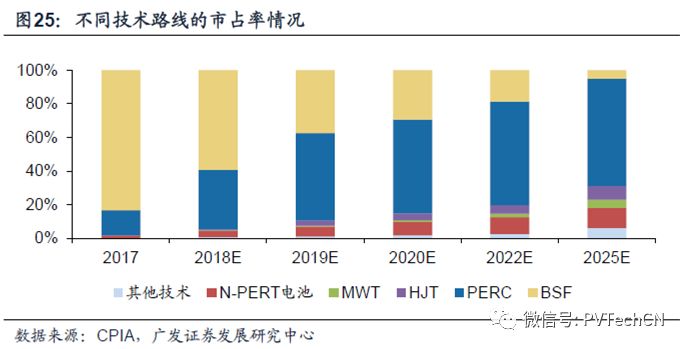 高效能、高性价比、多元化性能已成为光伏电池和组件行业的发展共识。在推动上游原材料成本不断降低的同时,未来市场还需要通过电池与组件端效率不断提升,以实现系统成本的降低。目前来看,PERC技术及HJT技术会是电池未来发展重点,尤其PERC电池已实现大面积量产且效率持续提高,预计在龙头企业投产的情况下,市占率将持续提升。