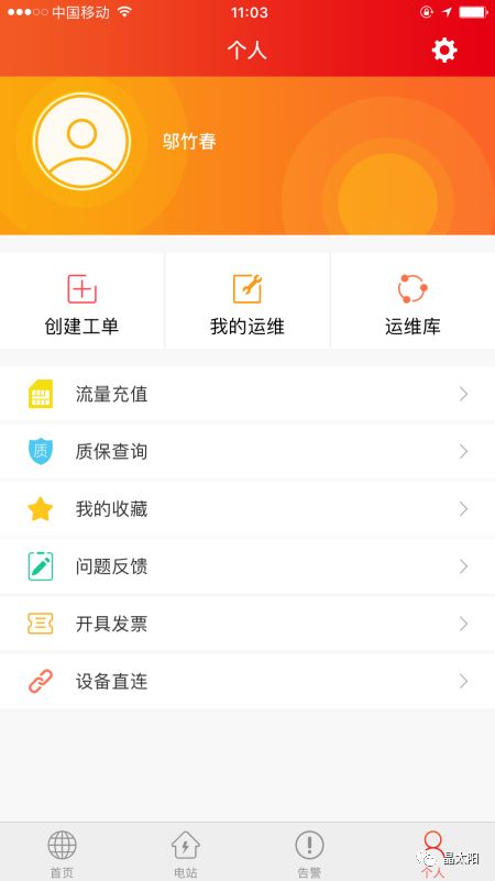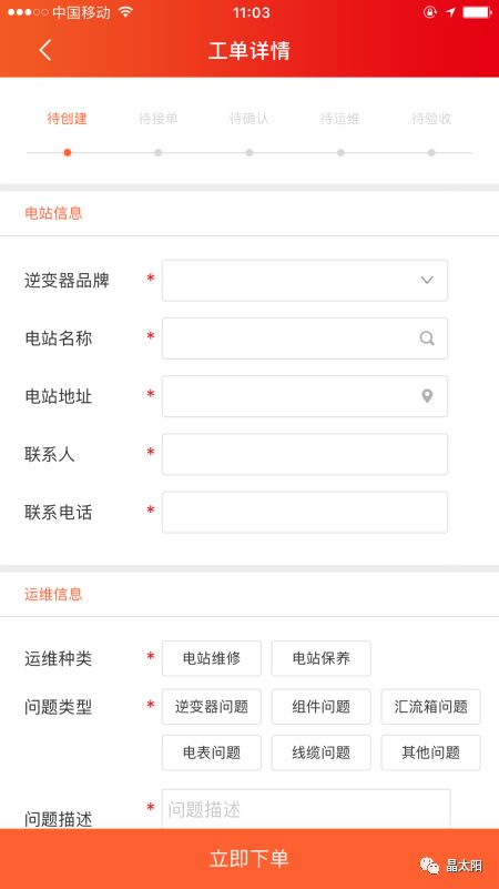 当光伏系统因故障而无法发电或者系统需要保养维护时,可以在“晶太阳”APP上下单,系统会安排附近专业运维人员上门维护。具体操作如下:在APP中点选“个人”---->创建工单,填写详细信息既可以发布运维需求到晶太阳共享运维平台。等待运维人员接单,前来运维,最后根据运维结果验收完成运维流程。