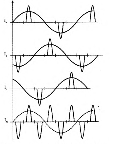 刚刚在上文描述过,当三相负荷平衡时,零线上的电流很小,接近为零。但是,这个结论的推导中有一个前提,这就是:三条相线上的电流是正弦波,并且在相位上相差120度。那么,当电流不是正弦波时,这个结论发生了什么变化呢?
