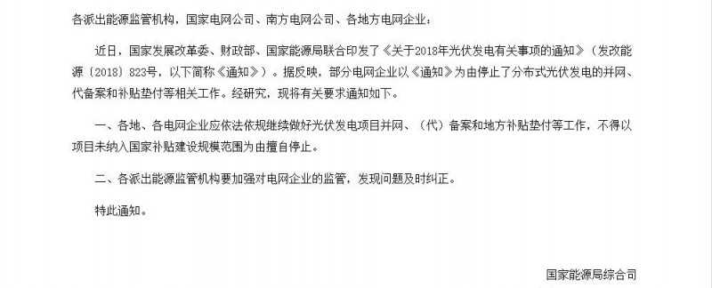 主要内容:各地、各电网继续做好光伏并网工作,不得以未纳入国家补贴为由擅停。