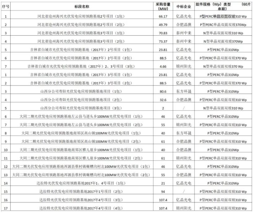 7月6日,作为第三批领跑基地中标体量最大的企业,国家电投公布了将用于海兴、寿阳、大同二期、达拉特、白城五大领跑基地共计1.338GW的组件中标结果。亿晶光电(511MW)、合肥晶澳(238MW)、锦州阳光(228MW)、泰州中来(144MW)、东方环晟(120MW)五家瓜分了此次国家电投逾1.2GW的领跑者组件订单。