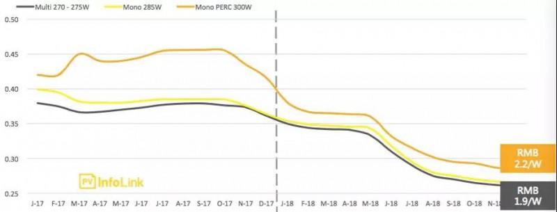 2017-18年组件历史价格与预测(Unit: US$/W),来源:PV Infolink