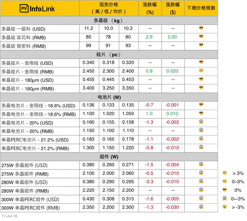 硅片价格本周也几乎持平,单晶的价格基本无调整,虽然七月多晶需求回升,但单晶硅片也有一定的需求支撑。而多晶硅片方面,多数企业的库存已回到合理水位,因此均价方面些微上升,大厂之间的交易尚无明显涨价,但小型电池厂已经感受到调价氛围,整体来看多晶硅片价格在七月下旬有回弹的可能。在硅片价格变动不大的情况下,且目前已经在每片1元人民币的价差范围内。后续单多晶的需求发展将视下游电池片、组件的报价而定。
