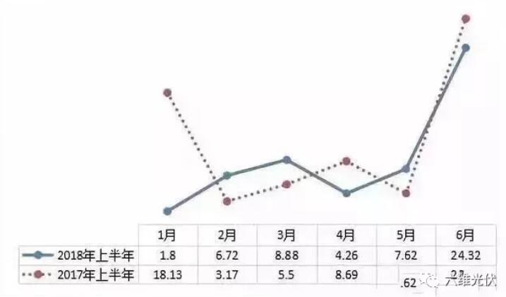 图4-2018年上半年与2017年上半年各月份工商业装机容量并网趋势图(单位:MW)