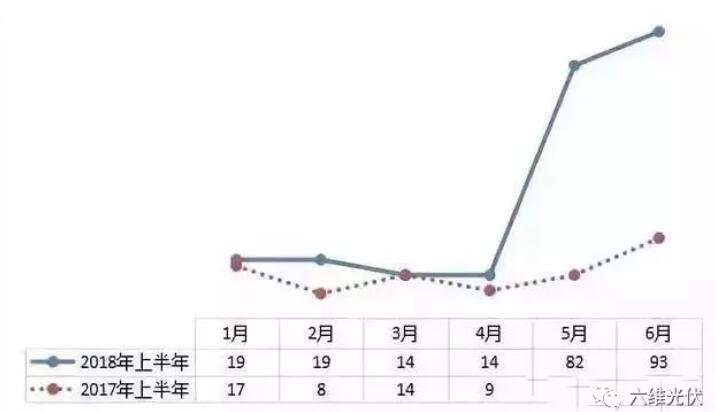 图3-2018年上半年与2017年上半年各月份工商业项目数量并网趋势图(单位:个)