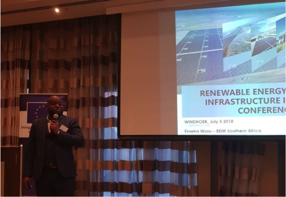 近日,晶科能源受邀出席第二届纳米比亚可再生能源和电力基础设施投资峰会并作主旨演讲。南非业务发展经理Emeka Wosu参加“实现纳米比亚能源自给自足”的对话讨论,期间,他分享了光伏组件质量的重要性以及作为全球最大的组件商,如何参与推动当地光伏产业发展。
