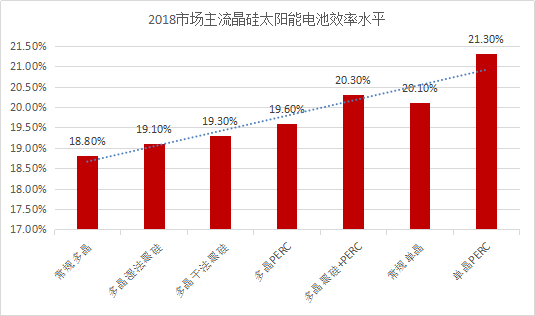 光电转换效率是晶体硅太阳能电池最重要的参数。2017年,我国产业化生产的常规多晶硅电池转换效率达到18.8%,单晶硅电池转换效率达到20.2%。