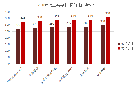 目前,PERC技术成为P型电池效率继续提升的主要方法,但PERC技术应用在多晶及单晶电池片上的效率表现有所差异。单晶电池产线在导入PERC技术后,可使转换效率绝对值提升1%以上,即单晶PERC电池产业化效率可达到21%以上,部分领先企业可将效率提升至21.5%;应用在多晶电池上有绝对值0.6%以上的效率提升,PERC多晶电池产业化效率可达到19.5%。此外,若在多晶PERC电池上叠加黑硅技术,产业化效率可达到20%以上。目前市场主流太阳能电池效率水平及组件功率如下图所示。