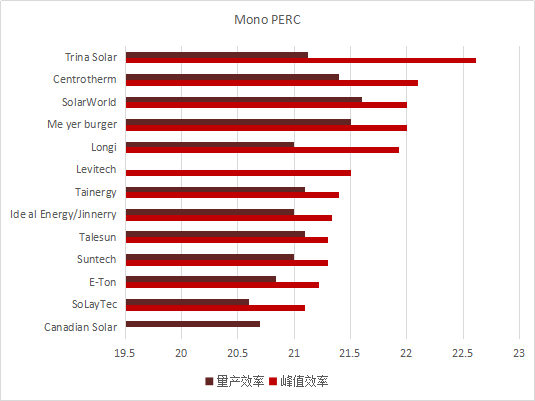 目前,领先厂商的单晶PERC电池的量产效率可以达21.5%左右,多晶PERC的量产效率可达19.7%左右。而截至目前,单晶PERC和多晶PERC的世界最高效率分别已达23.6%和22.04%,分别由隆基乐叶和晶科能源创造。可以看出,PERC电池仍有很大的效率提升空间。