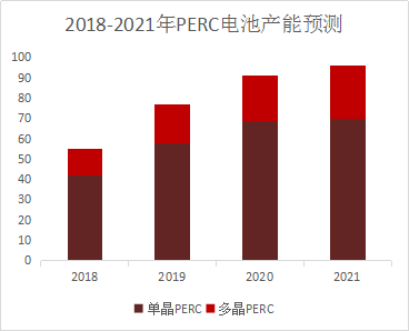 随着PERC技术成熟度的不断提升,常规单晶与单晶PERC的成本差距在逐步缩小,预计2018年起,PERC将逐步替代常规单晶,成为单晶产线的标配。多晶方面,在金刚线切多晶硅片搭配黑硅技术大幅降本提效的基础上,再叠加PERC技术,可以实现“1+1>2”的效果,预计2018年起,电池厂商将陆续开始做多晶黑硅+PERC技术的升级。据PV infolink预估,2018-2021年,PERC年产能将逐步增加,分别达到55GW、77GW、91W和96GW,如下图所示。单晶PERC仍将占据PERC市场的主要份额。