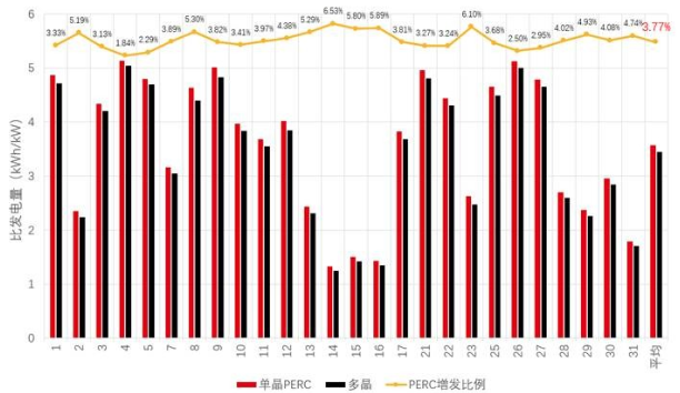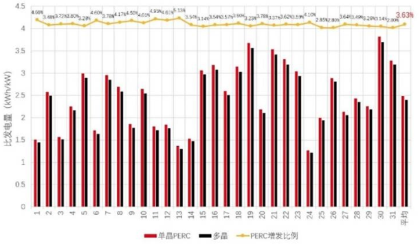 PERC组件多发电的原理在于其优秀的低辐照性能,更好的功率温度系数以及首年光衰问题的解决。电站端的实际测试中,PERC组件比常规组件每瓦发电量高出3%左右。