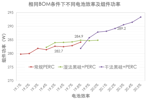 在多晶黑硅+PERC电池技术上,目前主要有直接制绒、湿法黑硅(MACE)与干法黑硅三种方案。与目前的工业水平相比较,湿法黑硅方案具有较强的竞争力。